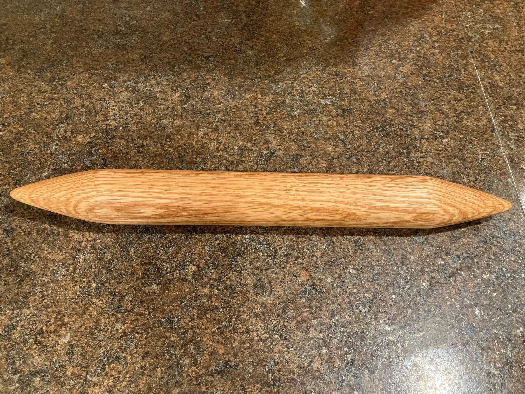 Made an early Christmas present for Rachel today: an oak rolling pin. Started out square but with a saw, belt sander, draw knife, and some time, I got it functionally round.