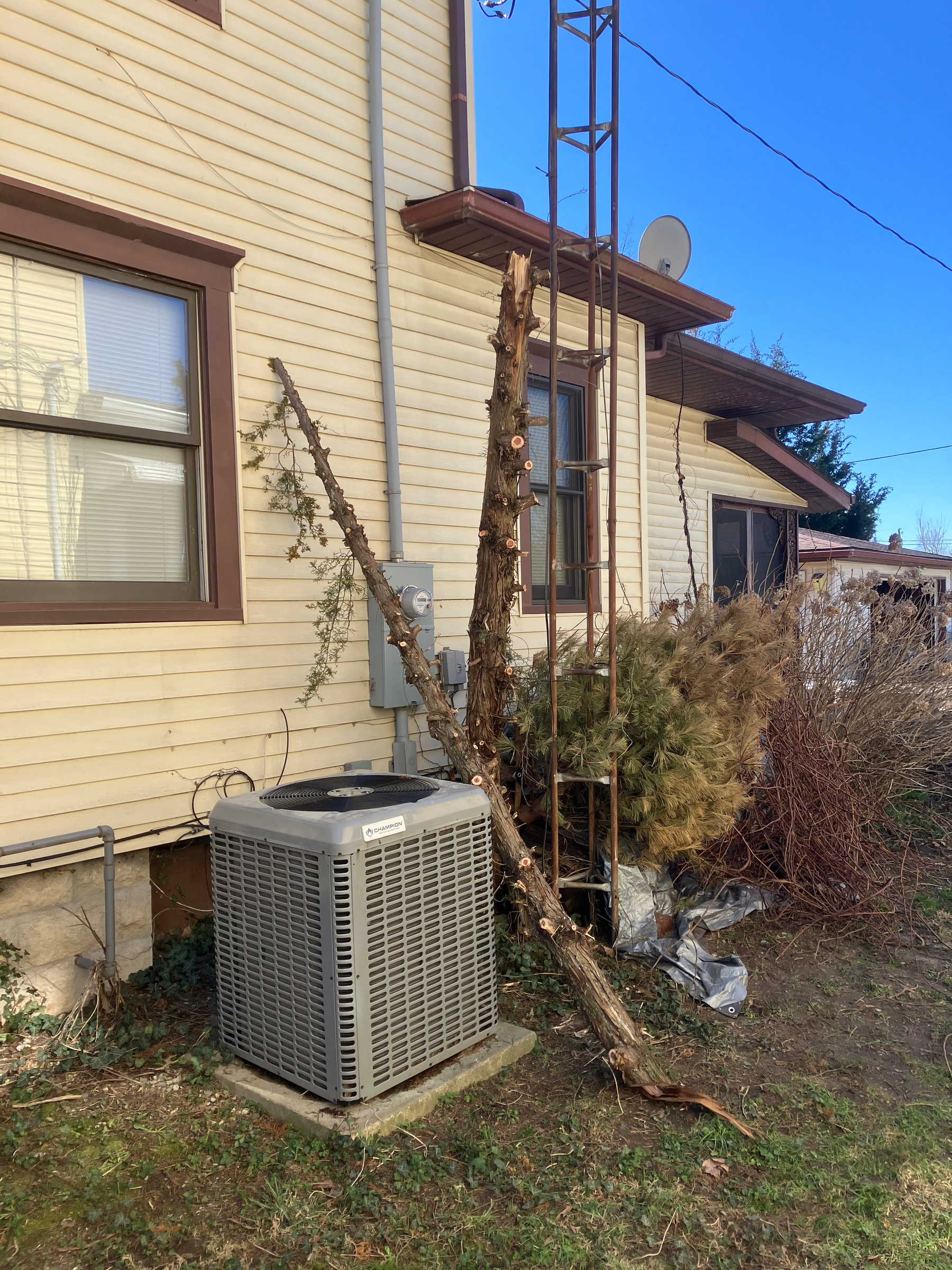 This is as far as I got with a handsaw. My father-in-law is going to come over with his chainsaw to cut it closer to the ground and chunk it up for firewood. While I was doing that, Rachel pulled all the limbs around front, plus a bunch of other clean-up. Then I took a nap in the sun!