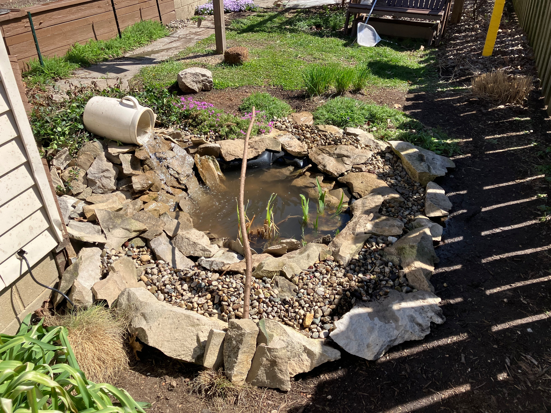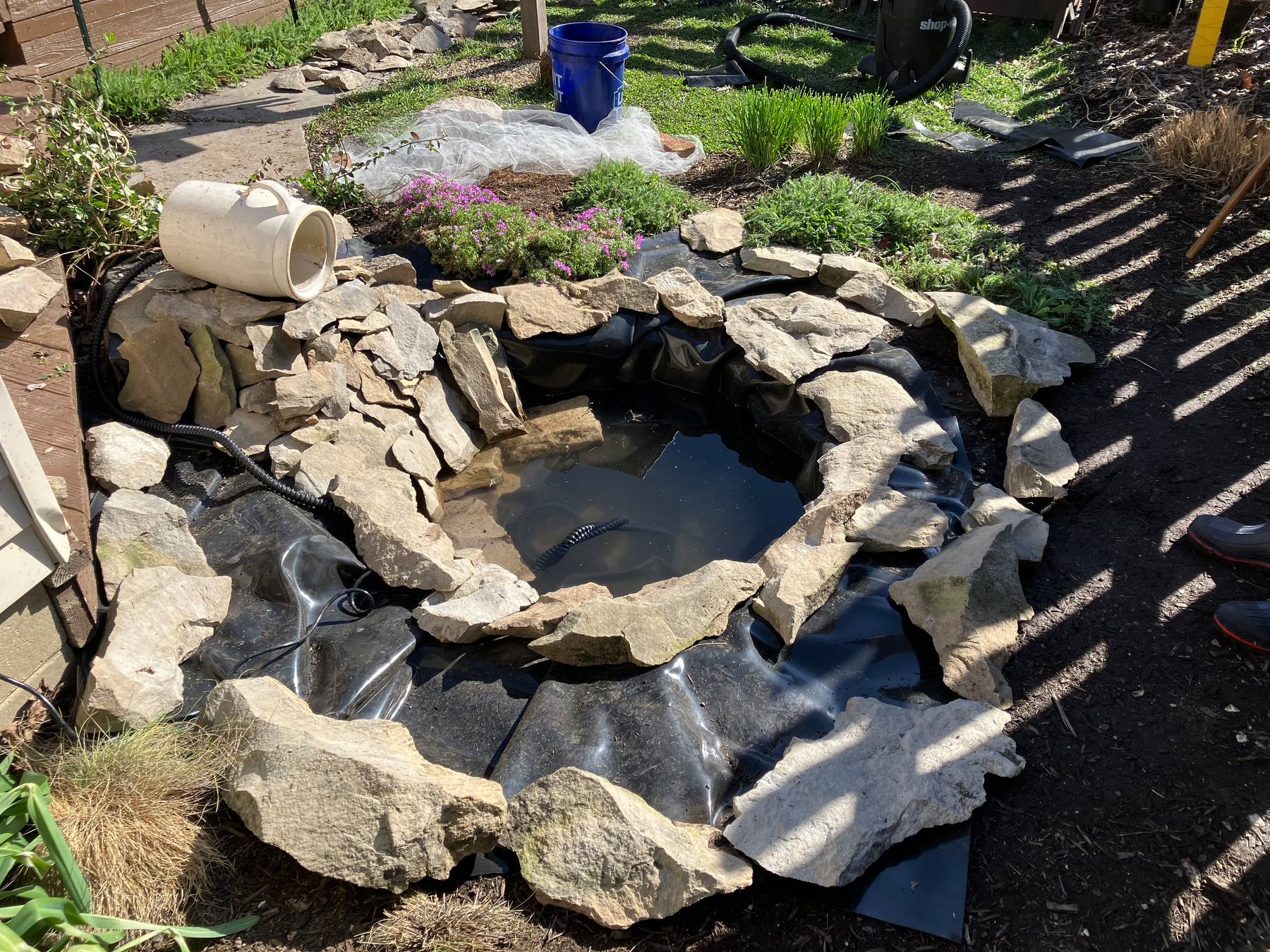Finally, we got all the rest of the limestone in place, filled in with gravel, and got the perching stick back into place. We still have more aquatic plants to put into place but it’s much better!